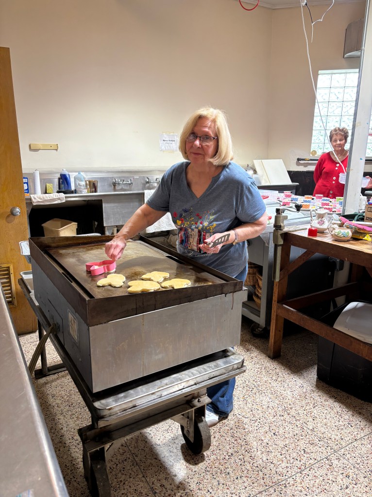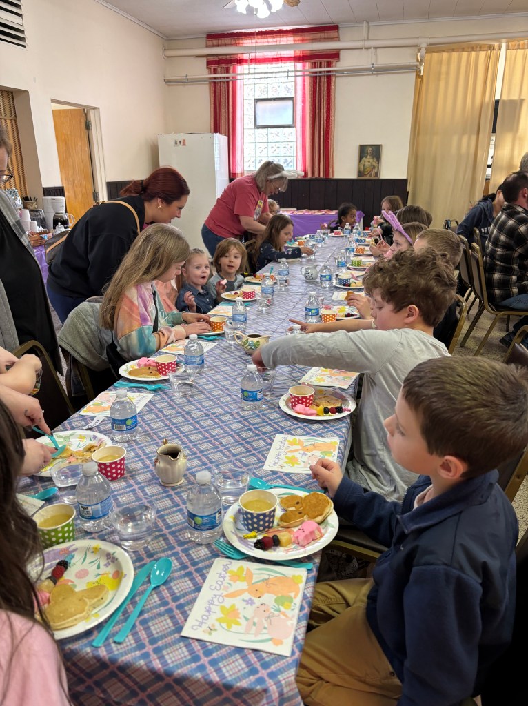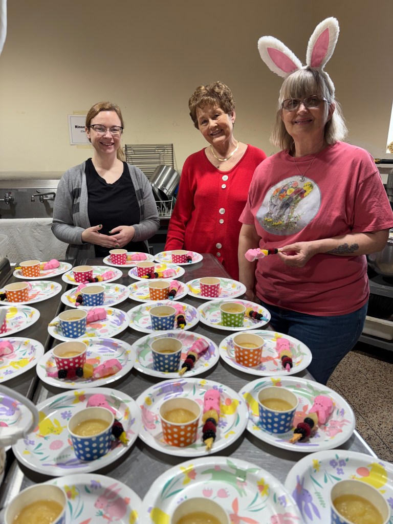A bunny-pancake breakfast, fruit kabobs and applesauce was served after which children decorated cupcakes to take home.